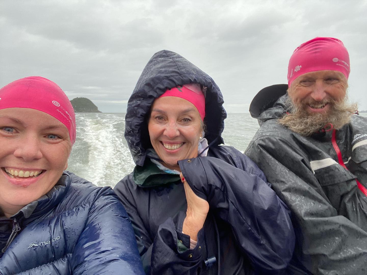 I’m up before the sun and I can see the trees moving outside. I wake my household and we head to the meeting point at the wharf which is busy with boat trailers and four-wheel drives. The lights of mobile phones flash in the dark as the organisers talk and strategise. There’s trouble. One of our support boats has broken down, one of our swimmers tested positive for Covid, and there’s a weather system brewing to the south.