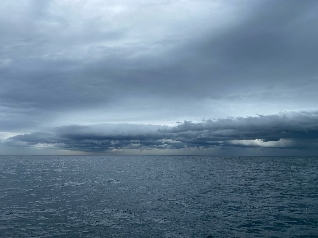 There’s a dense grey storm system ahead, directly in our path. I’m in the water when I feel the shift.