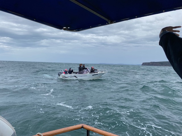 The tinnie jolts and thuds as we head into the swell, Dan working hard against the wind. Nada and I keep our eyes trained on Michael, who is doing it tough. It’s hard to keep a track of him – the swell has doubled in size and we lose him for minutes at a time. Eventually he makes his way back to the boat and we haul him in. We check where we are against the shore. We’ve gone backwards.