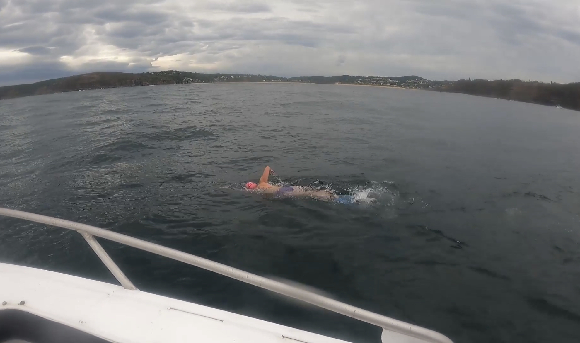 The swell up until now has been friendly, pushing us forward towards Umina. But the energy changes around me. The swell is growing, and there’s chop on the surface now, mussing up the water, sending white spray in my face as I try to breathe. I find myself kicking harder, digging deeper on my strokes. I have to push up to see where I’m going, the water’s flying everywhere. I keep my eyes fixed on the boat.
